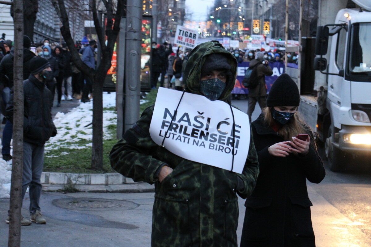 „Prvo zakon, pa onda porez“, „Porez da, pljačka ne“ i „Penzioneri su uz frilensere“ su neki od poruka koje su okupljeni iskazivali putem transparenata.