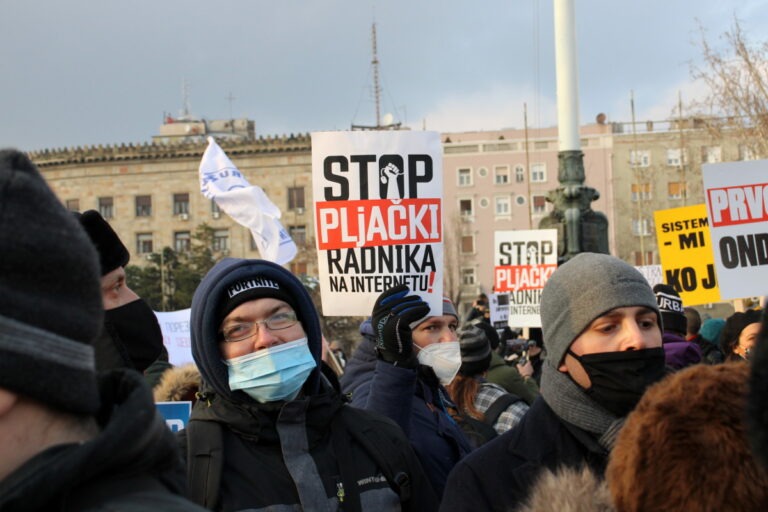 Ispred Skupštine Srbije okupilo se nekoliko hiljada ljudi na protestu koji je organizovalo Udruženje radnika na internetu. Okupljenima su se obratili i frilenseri, predstavnici udruženja Odbranimo reke stare planine i Zaštitnik preduzetnika i privrednika Srbije.