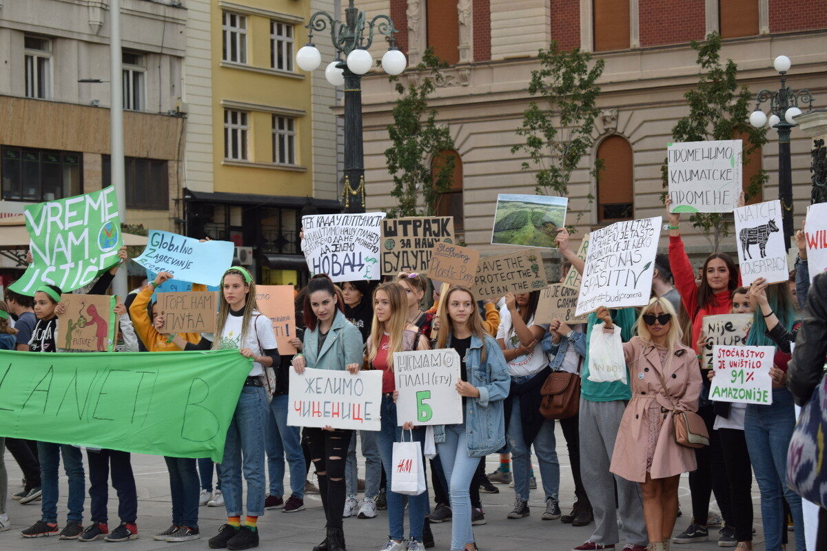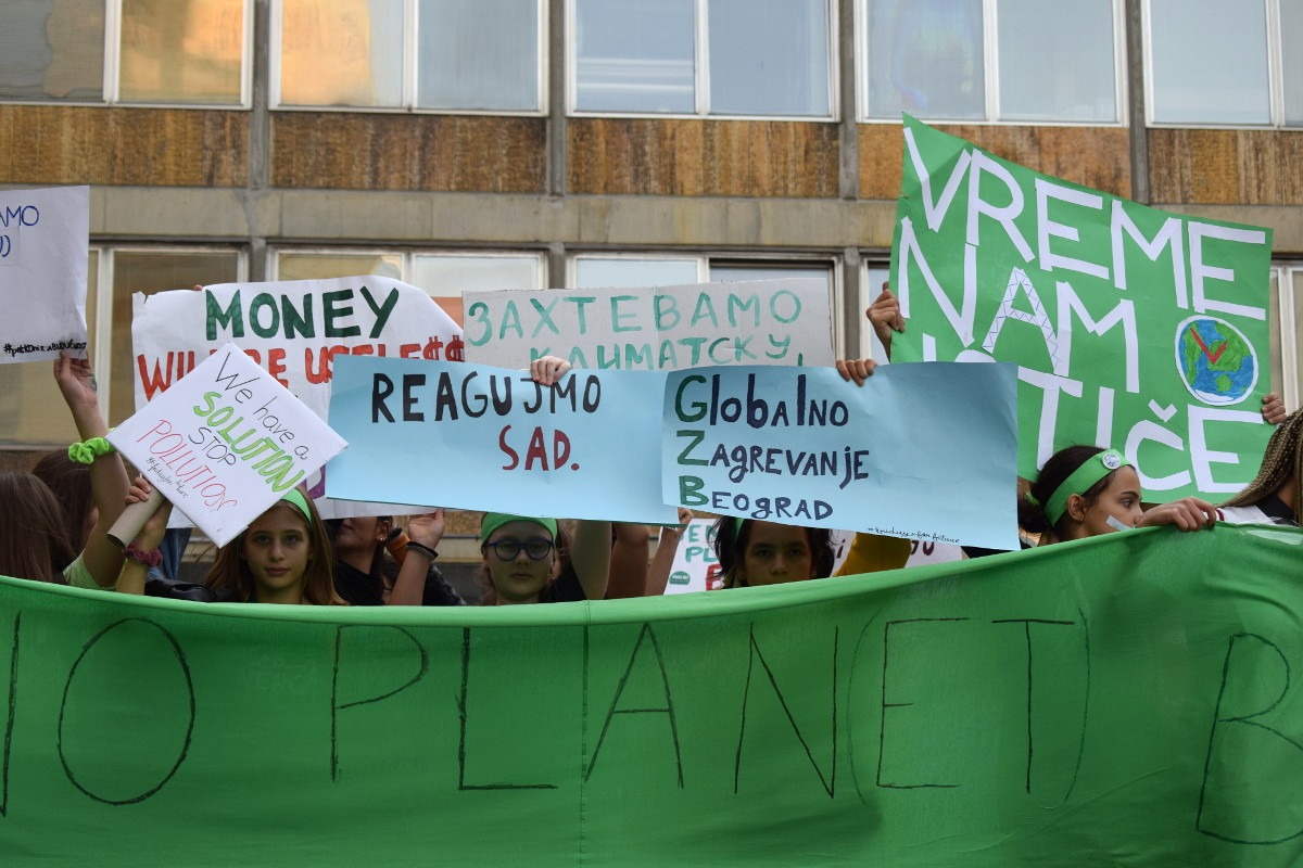 Okupljeni na protestu nosili su transparente „Nemamo planetu B, Reagujmo sada“, „Niko nije premali da napravi promenu“, „Novac će biti beskoristan na mrtvoj planeti“, „Kapitalizam ubija planetu“ kao i „We are solution for pollution“.