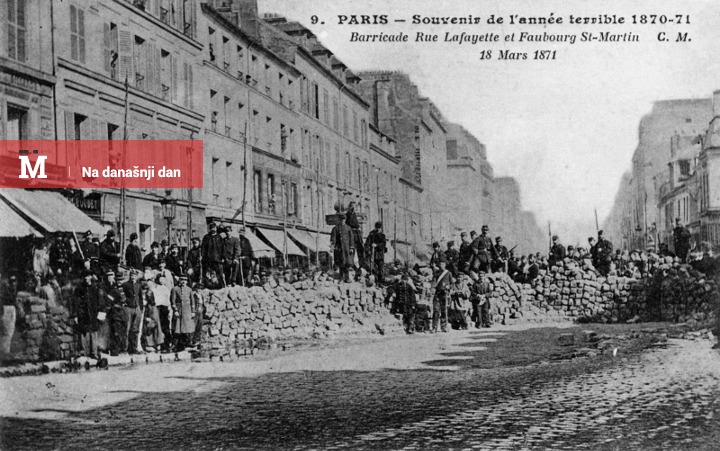 Na današnji dan 1871. godine u Parizu uspostavljena je narodna vlast – Pariska komuna. Ulazak u rat s Prusijom, u Francuskoj je doveo i do zaoštravanja borbe između buržoazije i proleterijata. Jedan od rezultata ove borbe je i sprovođenje prve radničke revolucije, odnosno preuzivanje kontrole nad Parizom od strane radnica i radnika. Narod je uspostavio novu vlast preko koje su pokušali da uspostave slobodu i jednakost za sve, a tokom postojanja Komune ukinuta je vojska, država sekularizovana ukidanjem davanja za crkvu i nacionalizacijom crkvene imovine, fabrike su predate radničkim udruženjima na upravu, a ponovo su otvorene one fabrike u kojima je obustavljen rad tokom rata. Uspostavljena je ravnopravnost polova, uvedeno obavezno i besplatno osnovno školovanje, pokrenuto pitanje osmočasovnog rada i proglašeno je načelo „alat radnicima, zemlja seljacima, rad svima“. Ovi značajni politički pomaci su sprovedeni za svega 72 dana koliko je Pariska komuna trajala, već u maju iste godine Versajska armija je izvršila napade na Komunu, gde su nakon teških borbi preživeli komunari u kratkom roku većinom osuđeni na smrt ili prognani.